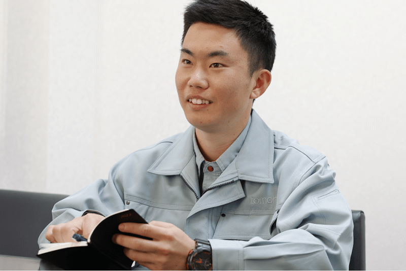 父親の仕事の影響で建築に興味を持ち、専門学校にて建築の資格関係を中心に学ぶ。専門学校の先生から勧められてトーモーと出会う。会社説明会にてトーモーが社員教育や資格に力を入れていることがわかり、入社を決める。趣味はスノーボード。1シーズンで3回くらい行く。