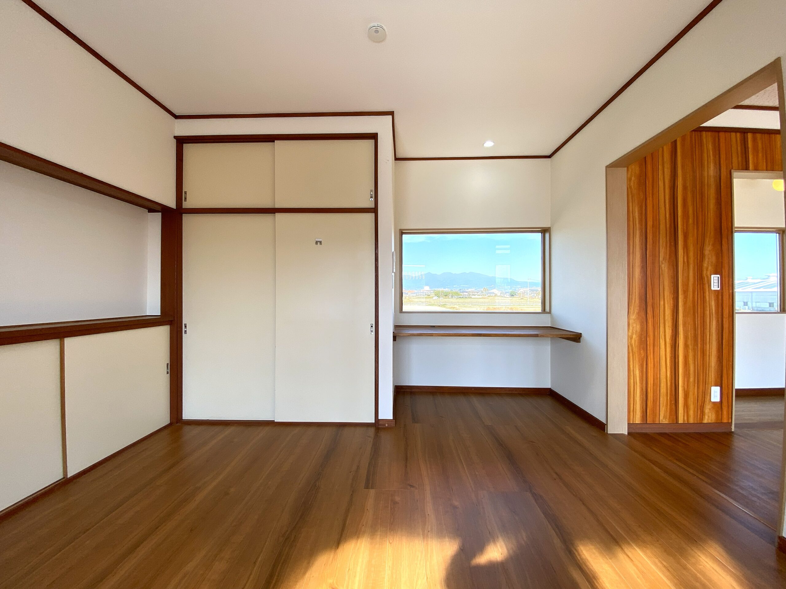 寝室では以前の出入口を塞いでアルコーブ状になったスペースに造り付けのカウンターテーブルを設けワークスペースにしました。ホビールームと同様、以前は「赤城おろし」が吹き込み寒かった引違い窓を断熱FIX窓に改修し、赤城山を描いた一枚の絵のようなピクチャーウィンドウとなりました。カウンターテーブル越しにお客様が改修前の時から残したいと希望されていた赤城山を眺めながら本を読んだりパソコン作業をおこなったり、ゆっくりコーヒーを楽しんだりできるスペースが出来て良かったと喜ばれました。