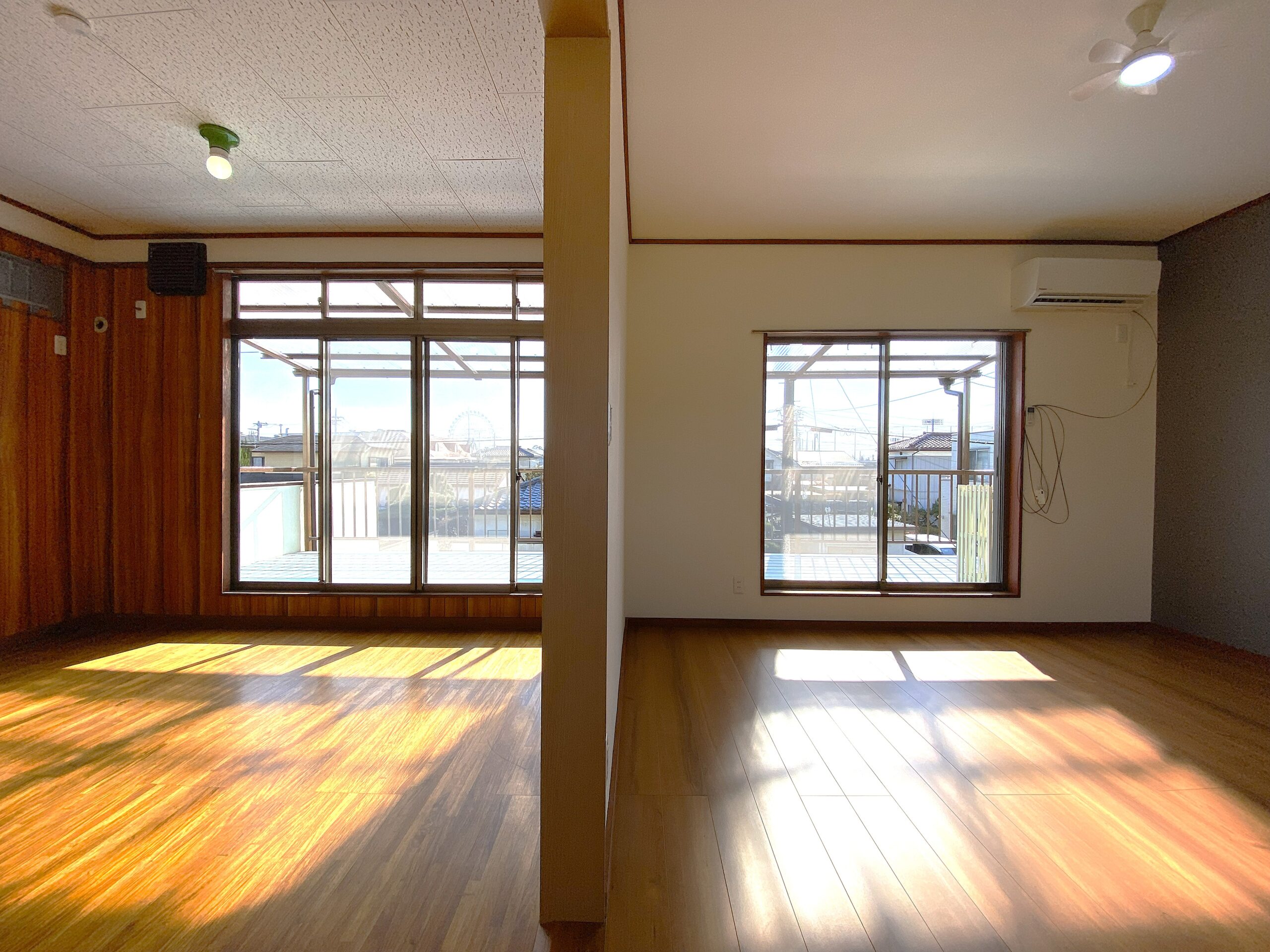 以前は8帖間と床の間・押入が付いた6帖間の続き間であった和室を広々とした一間のリビング・ダイニングとして洋室に改修しました。サッシは引違いの断熱サッシに改修し構造補強を兼ねて壁にした部分はテレビを置くスペースにしました。