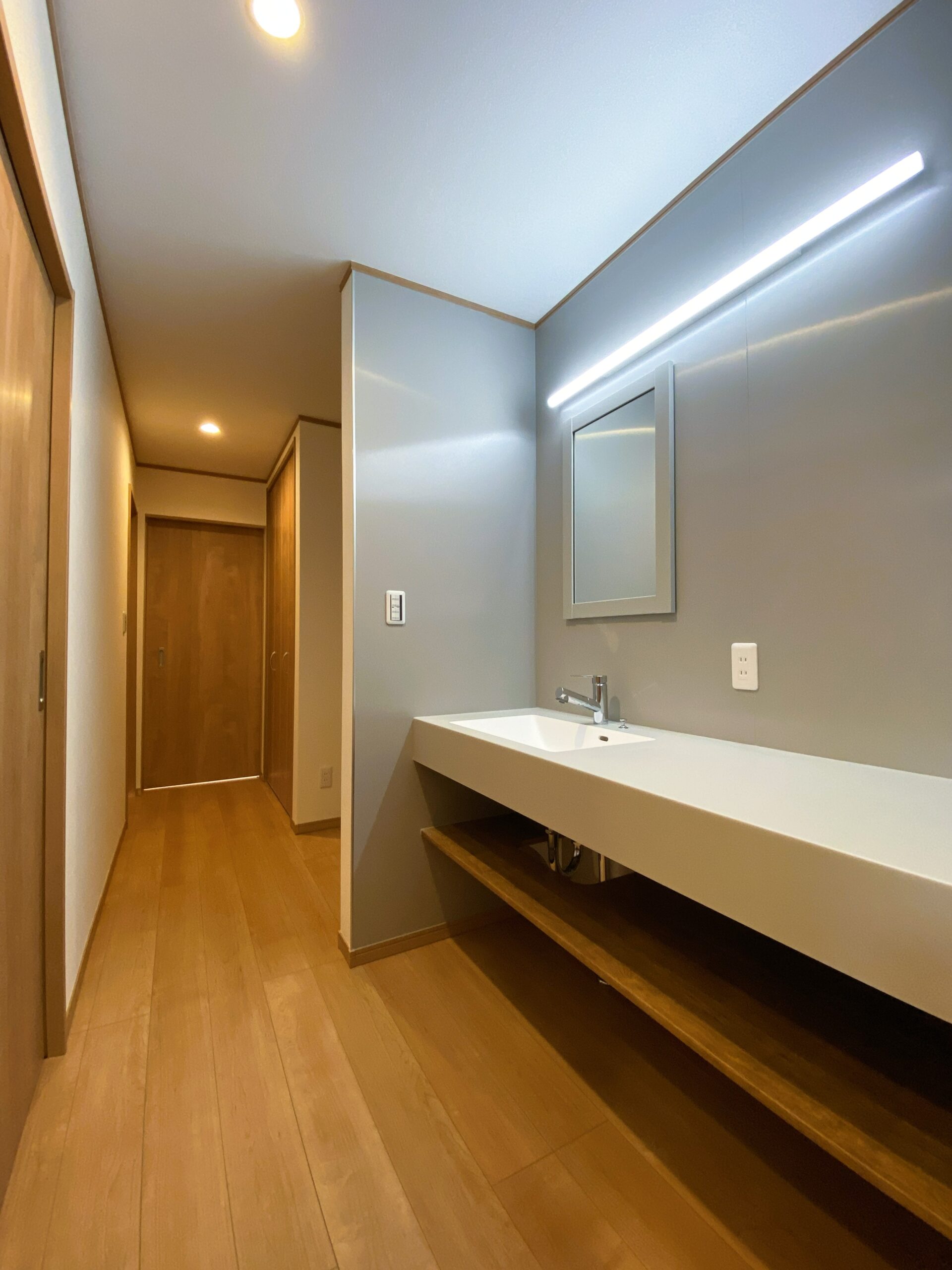 以前は1帖程の脱衣室に付いていた洗面ですが、狭くて使いづらかったとのお話を受け今回は廊下の一部に洗面コーナーとして設けました。横幅の広い洗面カウンターの下には棚を設けてあり、様々な備品は棚に置くことでカウンターはスッキリとした状態でお使いいただけると思います。