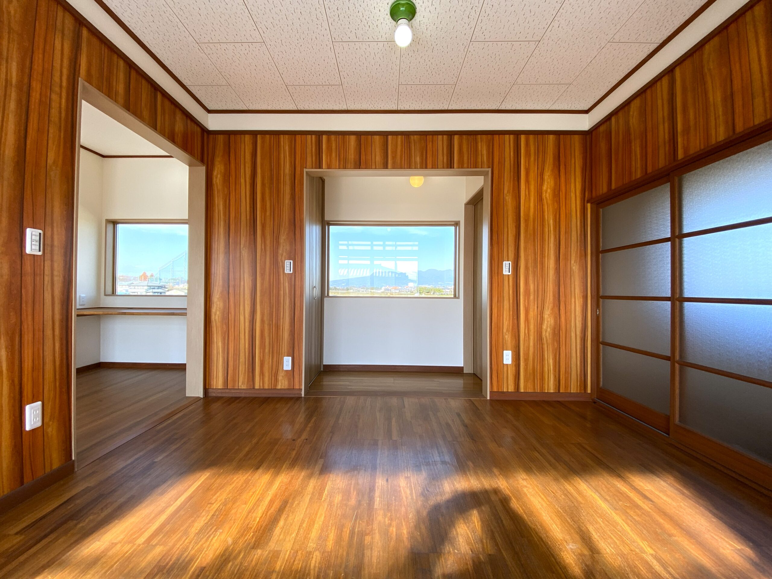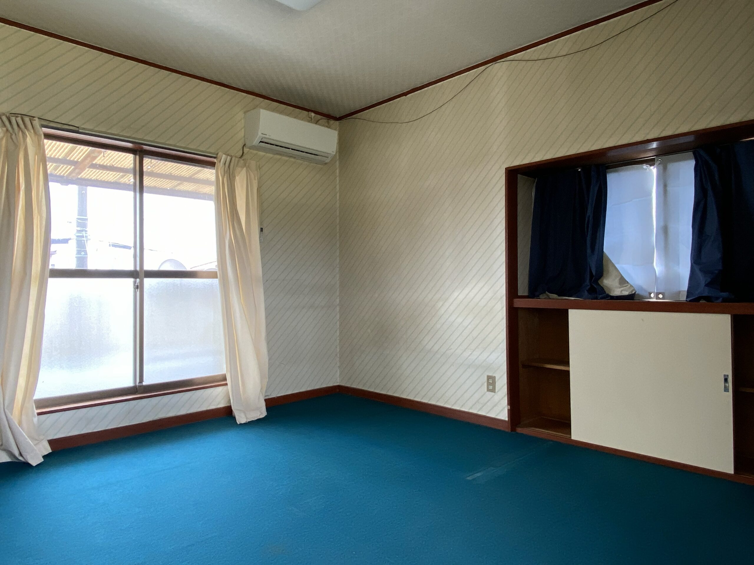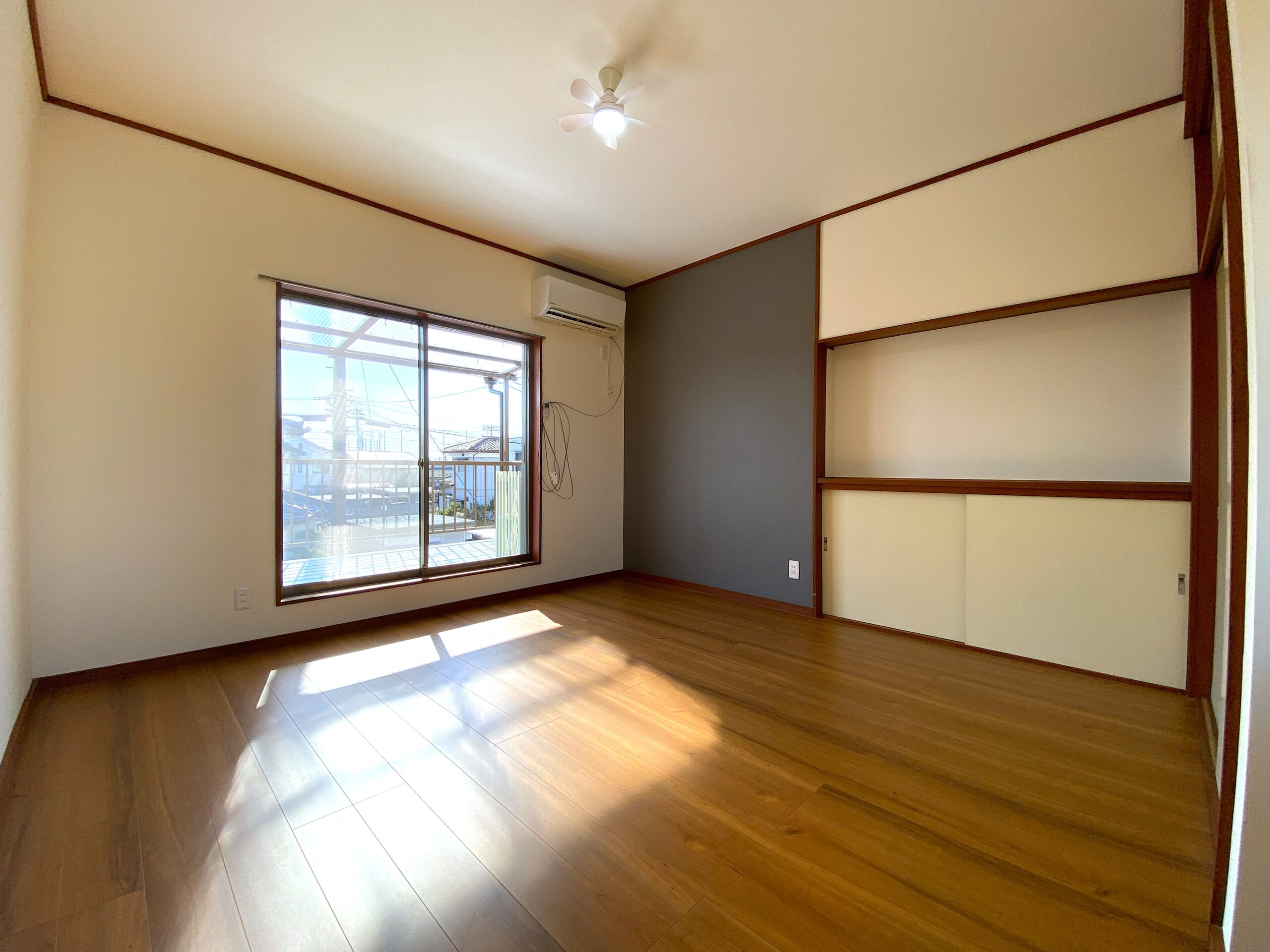 寝室は床・壁・天井の内装材を全て一新、床はカーペットからフローリングに改修しました。西日がきつかった出窓は窓を塞いでニッチに改修しました。バルコニーに面する引違い窓はホビールームと同様にサッシの中残をなくしました。色柄を一部だけ変えた壁紙がお部屋の良いアクセントになりました。
