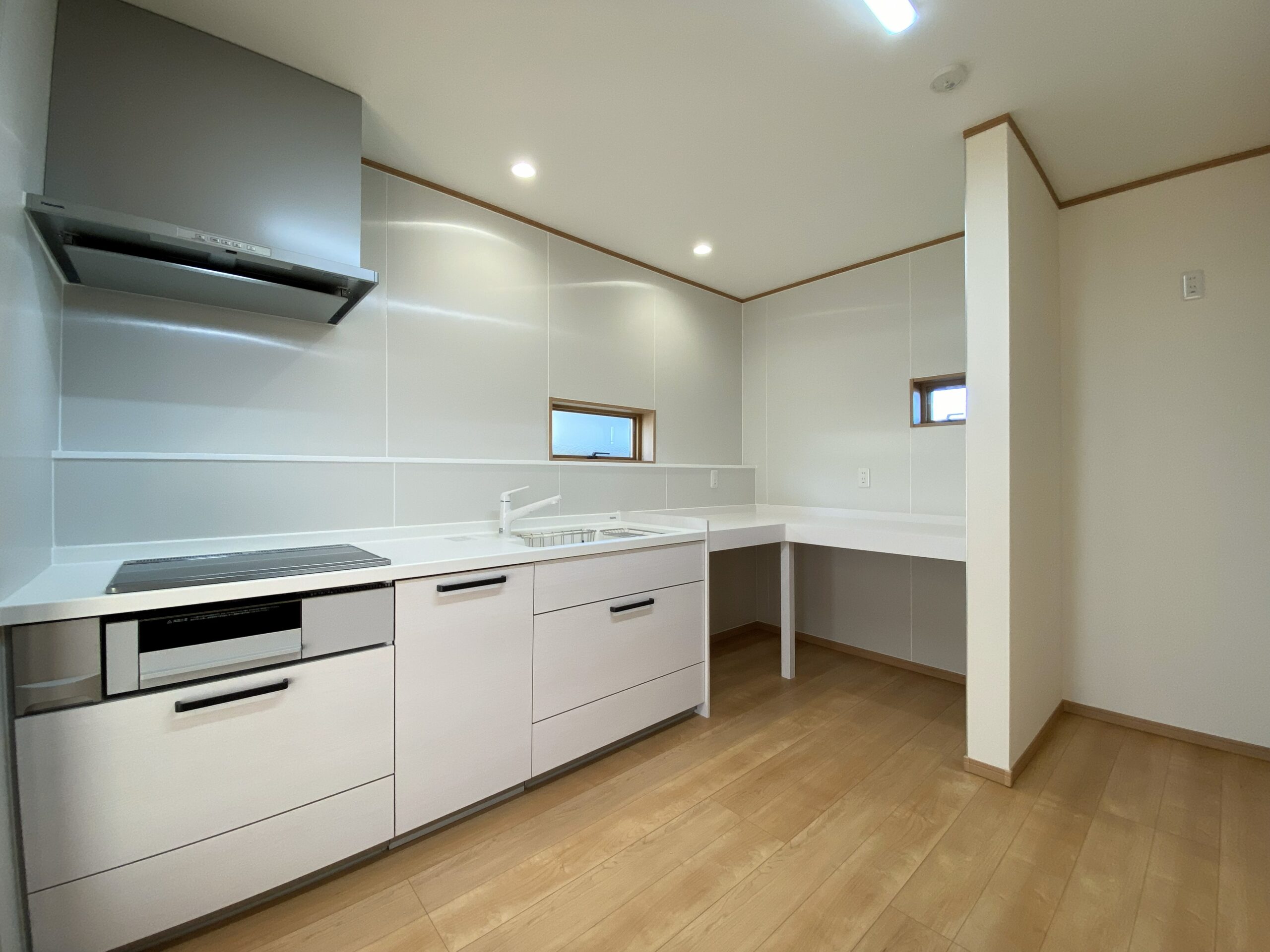 以前は一帖の押入、半帖の物入が付いた4帖半の和室をキッチンとして洋室に改修しました。IHヒーター、食器洗浄機が付いたシステムキッチンの脇には造り付けのカウンターを設けて壁にはキッチンパネルを貼り、清潔で使いやすくなるようにしました。キッチンから赤城山を見たいとのご希望に応え、カウンターの上に小窓を設けました。