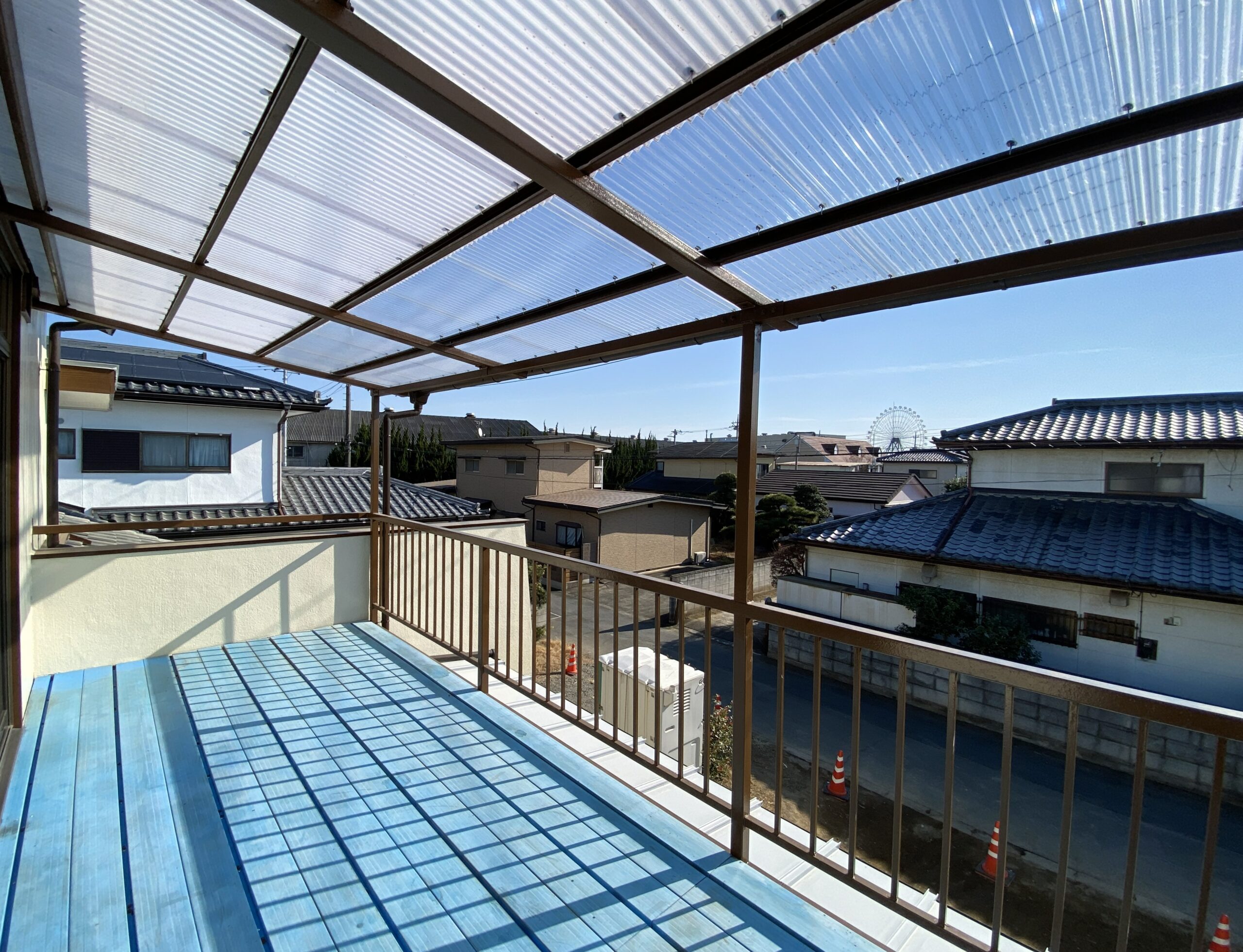 遊園地の観覧車の眺めがお気に入りのバルコニーは長年の雨風により傷んだ屋根材を更新、窓に近い範囲は乳白色、遠い範囲は透明にすることで夏場の日差しを遮りながらも冬場は陽が入りやすいように改修しました。骨組みは傷んでいた箇所を補強し全面塗装改修しました。