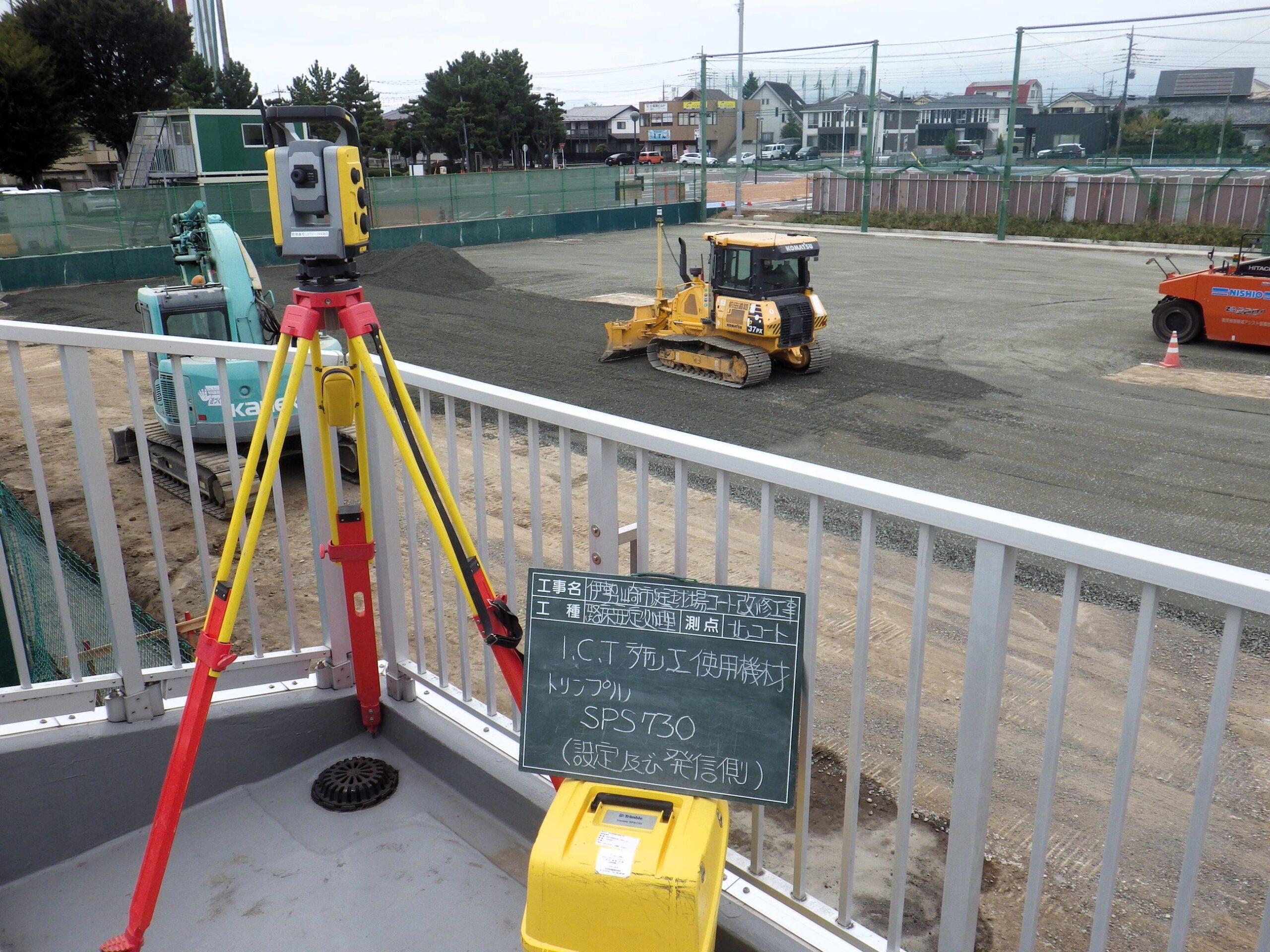 工事の主な内容はテニスコートの舗装改修(老朽化した人工クレイコート舗装を撤去、新たに砂入り人工芝を舗装)、壁打ちボードの改修(老朽化した壁打ちボードならびに壁打ちコートのアスファルト舗装を撤去新設)になります。現場は以前の改修から13年ほど経過しておりコート表面は南面・北面ともに皺や損傷、それらの補修跡が点在しプレーに支障をきたすことから利用者から早急な改修の要望が届いている状況でした。これらの改善に併せてコート内の排水性を向上し、より快適なコートに改修する事を目的として工事をおこないました。現場では庭球場内の照明移設工事が同時期に進められている為発注者及び工事関係者との工程の調整が必要不可欠であり、定例会議を定期的に行う事により互いに施工が支障とならないように進めました。新コートは新設した舗装の直上に人工芝を敷設する為、舗装の出来で仕上がりが左右されます。よって、舗装仕上がり面において平坦性の確保及び段差ができないようにする事が重要だと認識して施工にのぞみました。施工はICT建機にて重機械等をコントロールすることにより、期待通りの平坦性を確保する事ができました。施工業者には直前に舗装表面の仕上がりの重要性を訴え、人工芝の仕上がりの確保に努めました。