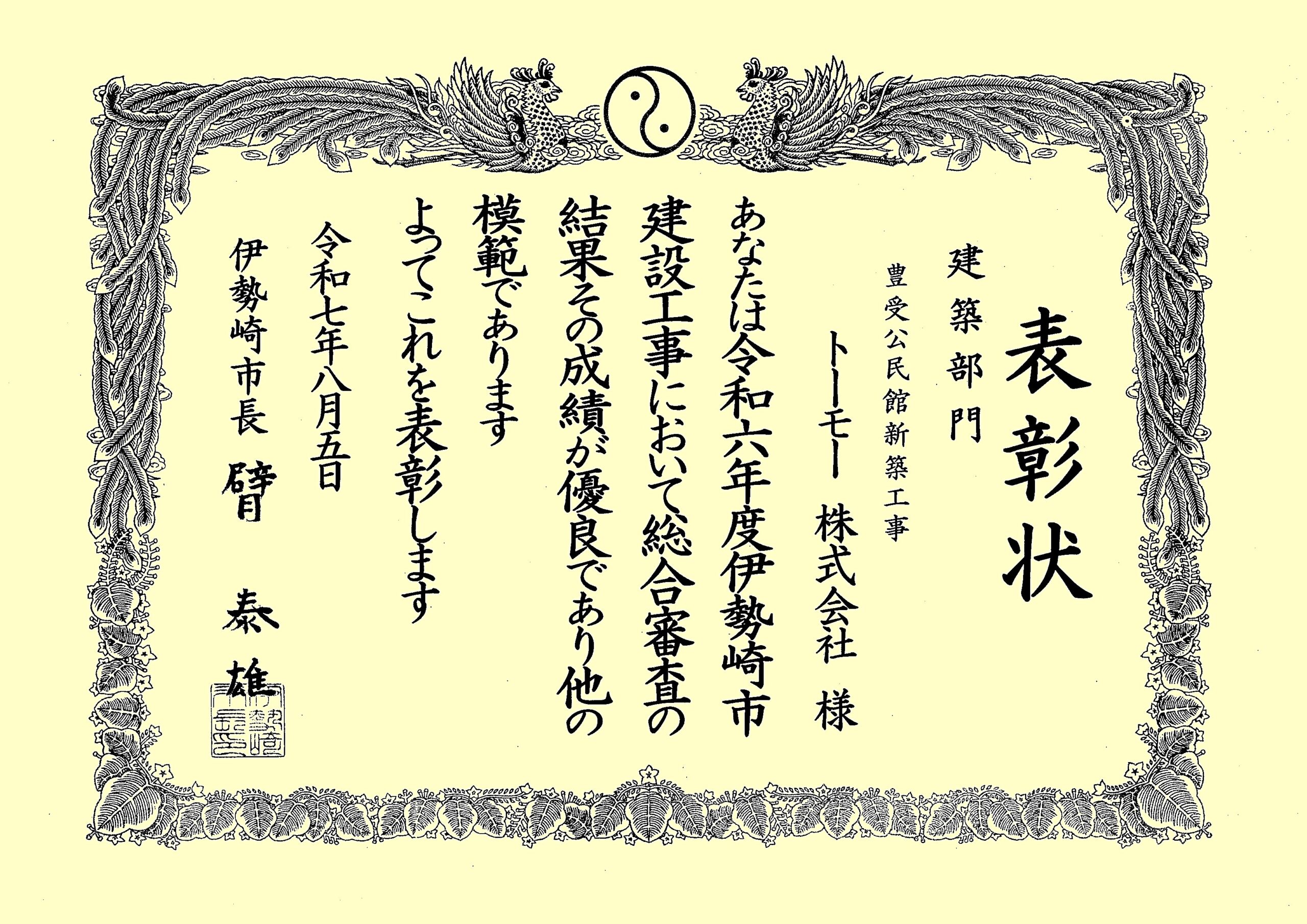 令和6年度に完成した伊勢崎市発注工事の中から優秀な成績をおさめた工事施工者、工事技術者を表彰する優良建設業者表彰において、当社が施工しました豊受公民館新築工事が伊勢崎市優良建設業者表彰(建築部門)をいただきました。併せまして同じく豊受公民館新築工事の監理技術者が伊勢崎市優良技術者表彰(建築工事技術者)をいただきました。現場担当者をはじめ当該工事に携わった社員の皆様、協力業者の皆様、おめでとうございます。当該工事を無事故無災害で滞りなく工事を終え、高い評価をいただくことが出来ましたのも発注者様、工事にご協力いただきました関係者の皆様、そして地域の皆様のご協力の賜物です、誠にお礼申し上げます。受賞を励みに地域の皆様から信頼され、必要とされるよう研鑽を積んでまいります。今後ともよろしくお願いいたします。