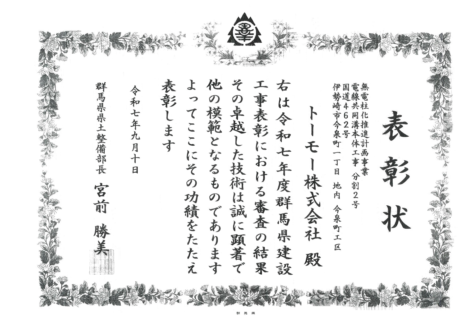 無電柱化推進計画事業電線共同溝本体工事(分割2号国道462号伊勢崎市今泉町一丁目地内今泉町工区)について、群馬県県土整備部長表彰をいただきました。当該工事を無事故無災害で滞りなく工事を終え、高い評価をいただくことが出来ましたのも発注者様、工事にご協力いただいた関係者の皆様、そして地域の皆様のご協力の賜物です、誠にお礼申し上げます。来年度も安全に高品質な工事を出来るよう社員一同頑張ります!